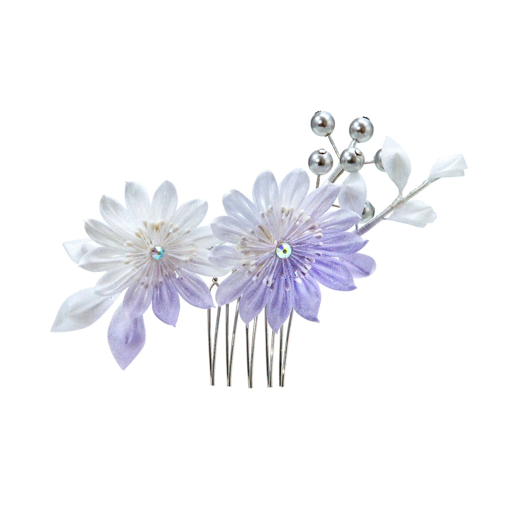 This hair ornament is made of pure silk habutae fabric woven using the traditional "nureyoko" method of the Kawamata region of Fukushima Prefecture, and then dyed with a gradation of "Suzuka-iro ink," a traditional craft from Mie Prefecture. Popular with kimono lovers, it boasts a subtle yet elegant and delicate look. The design features white tea flowers with imaginative colors. This hair ornament is made of pure silk habutae fabric woven using the traditional "nureyoko" method of the Kawamata region of Fukushima Prefecture, and then dyed with a gradation of "Suzuka-iro ink," a traditional craft from Mie Prefecture. The design features white tea flowers with imaginative colors.