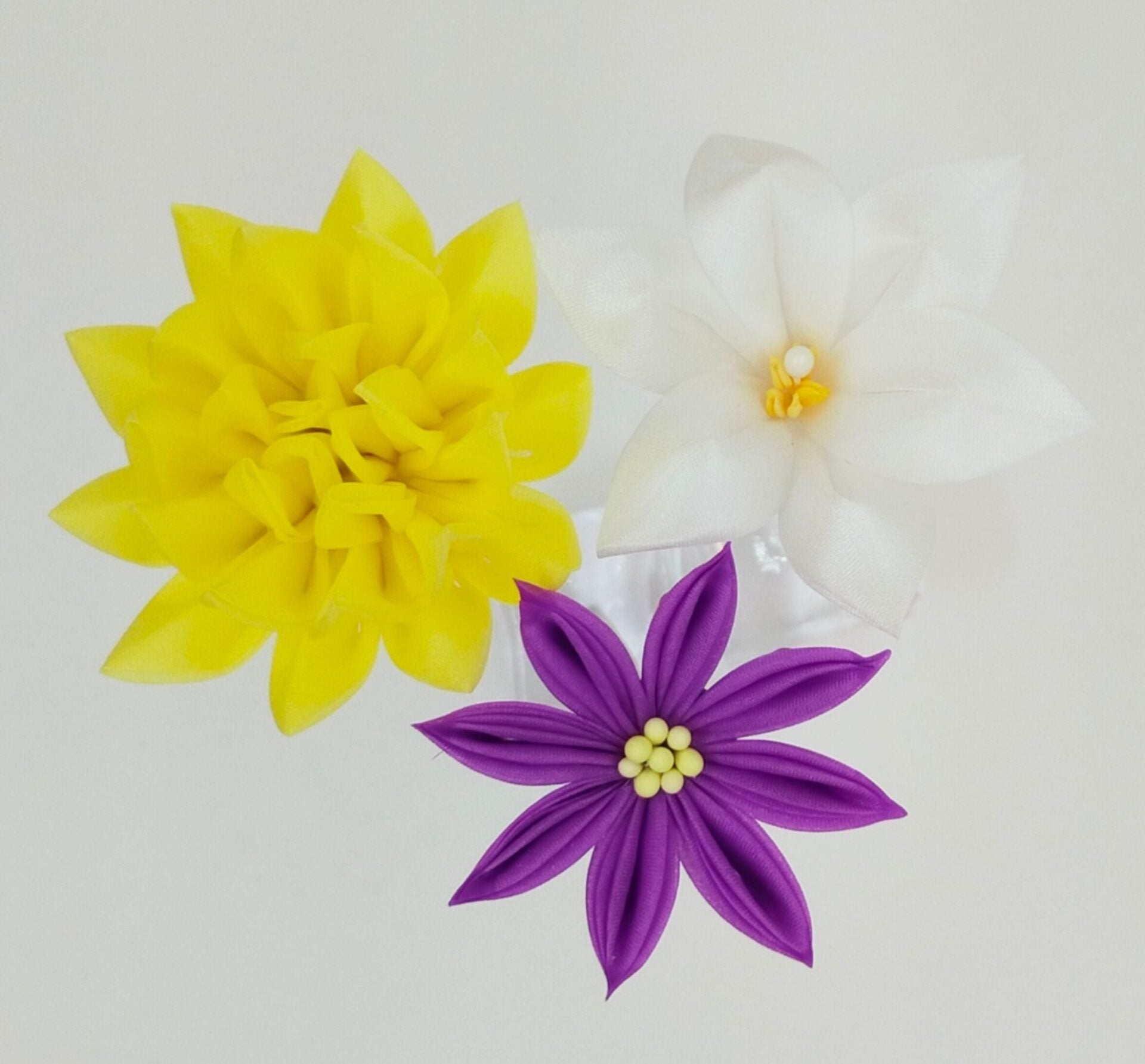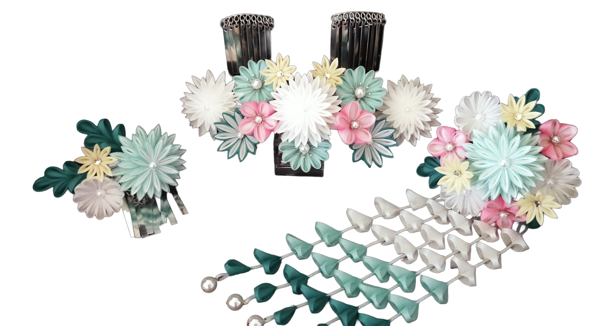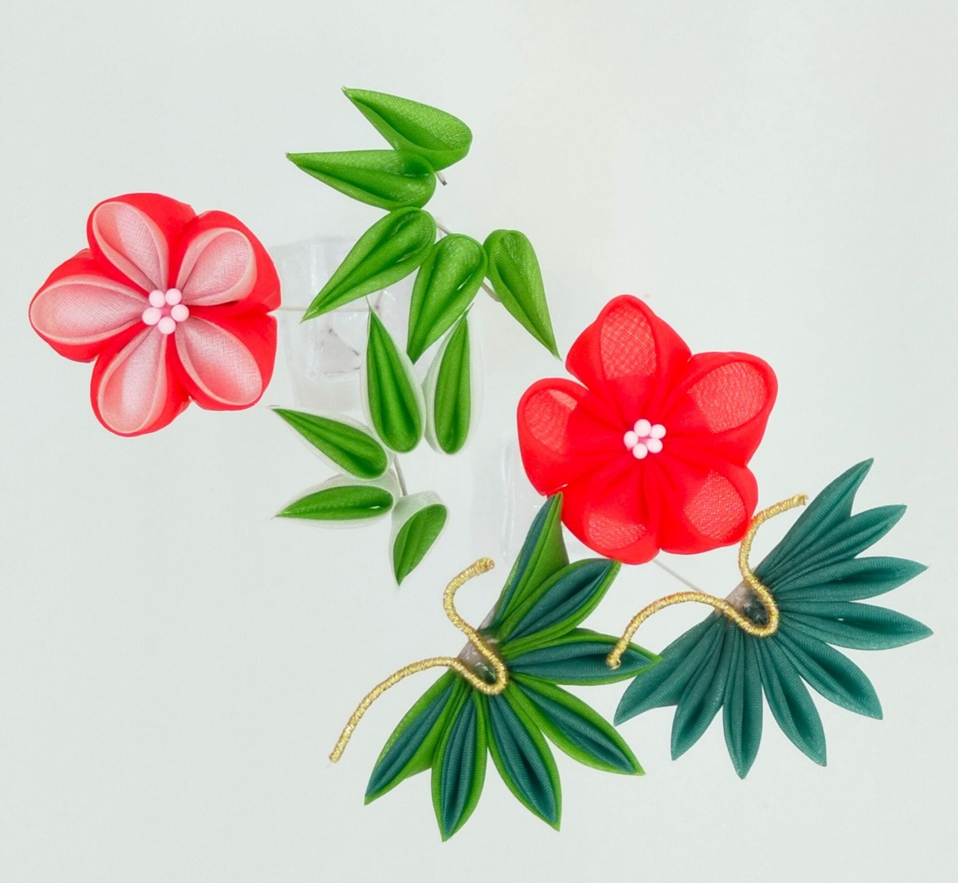 出来上がった花・さがり・ビラで3つのかんざしに組上げます。