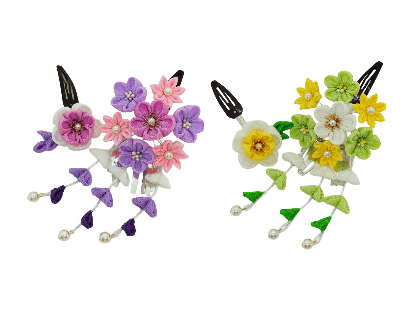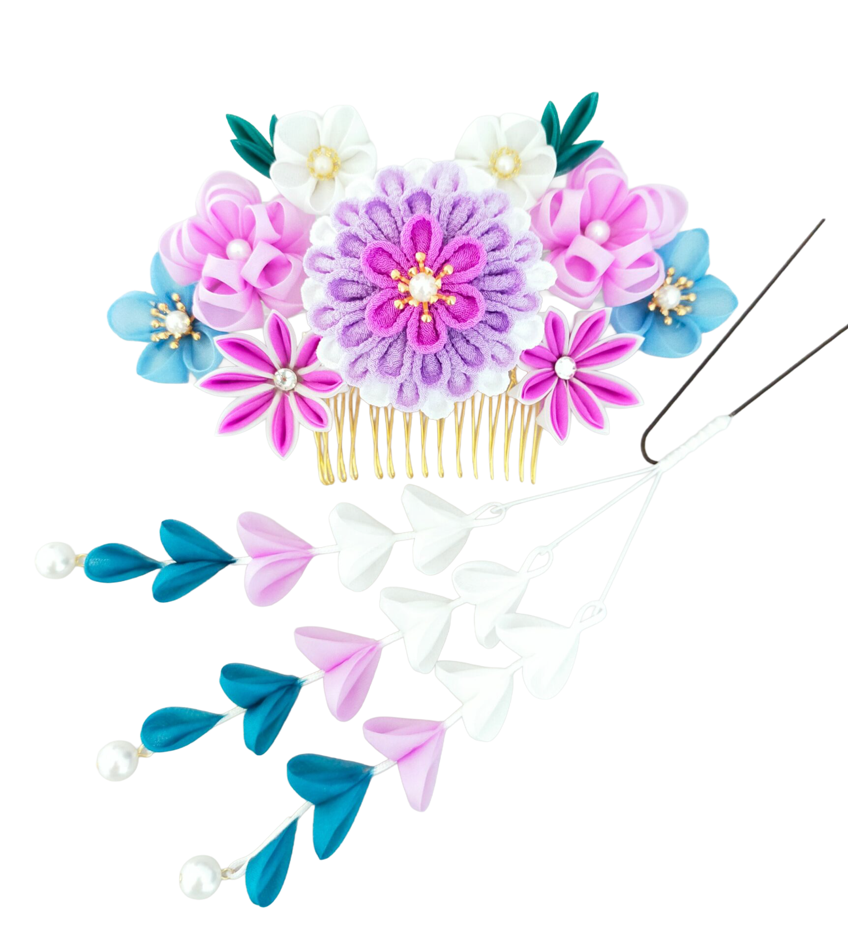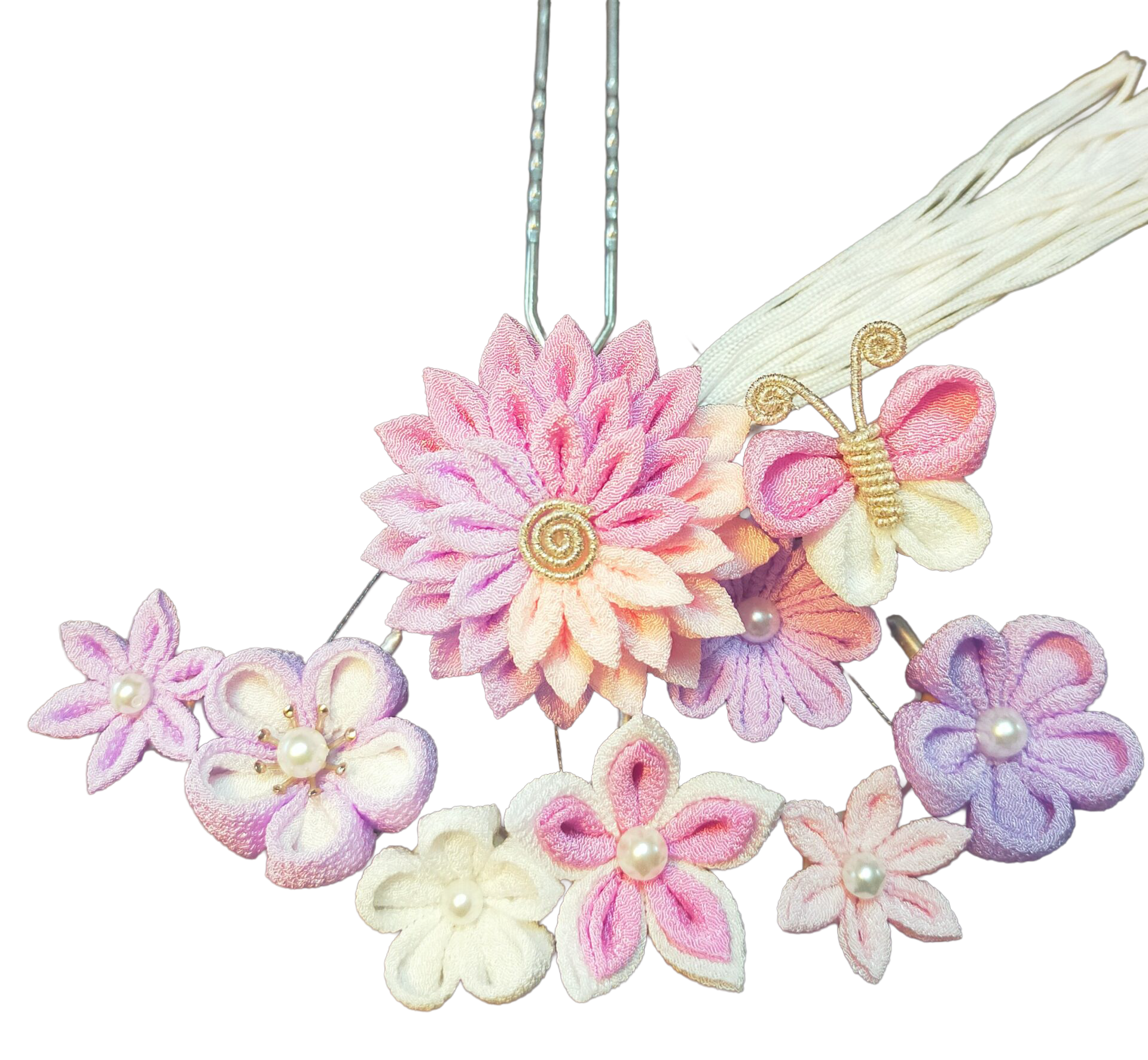 出来上がった花・さがり・ビラで3つのかんざしに組上げます。