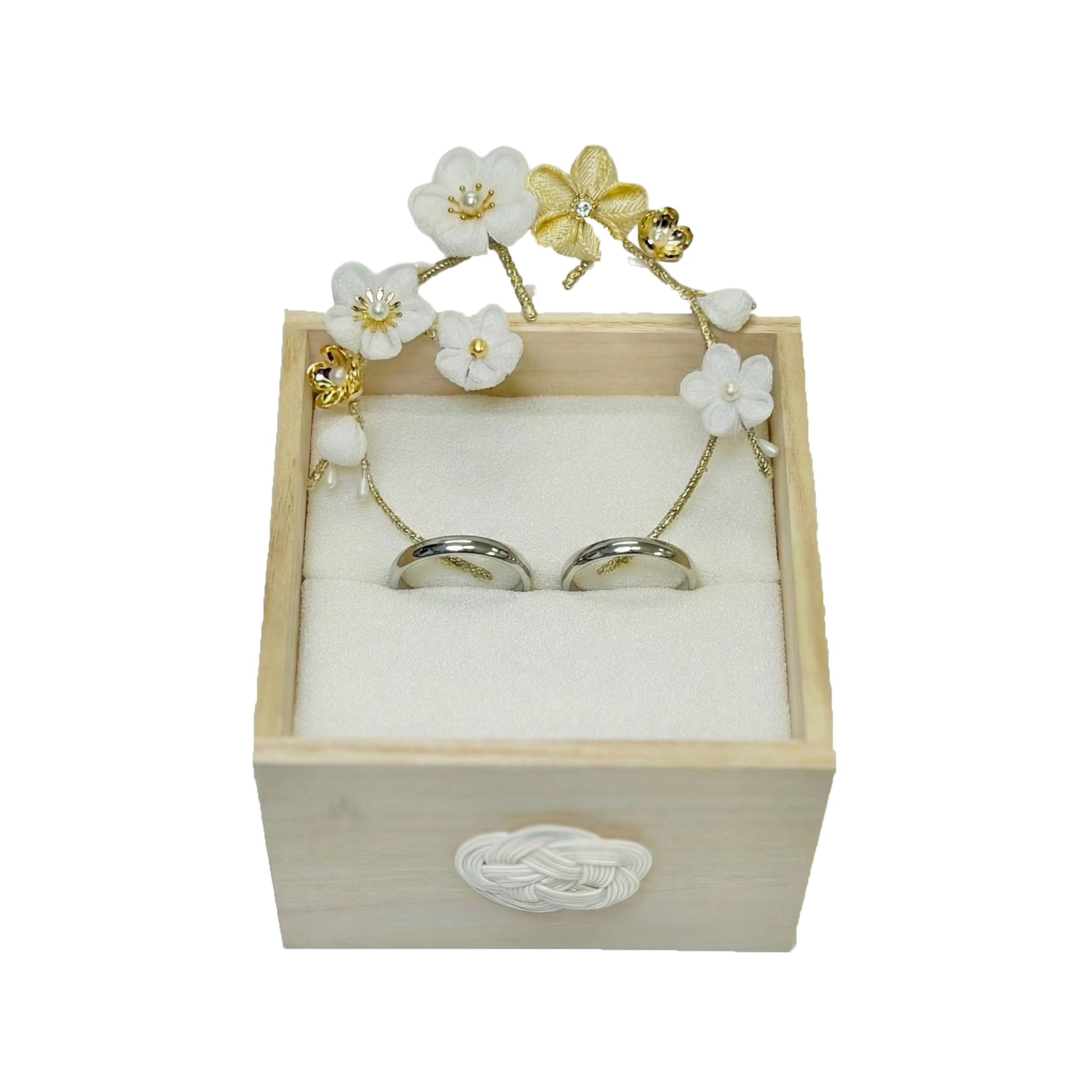 木箱に入ったリングピローに、つまみ細工で円満を表すサークルオナメントをあしらったARTEDIVAのブライダルコレクションです。