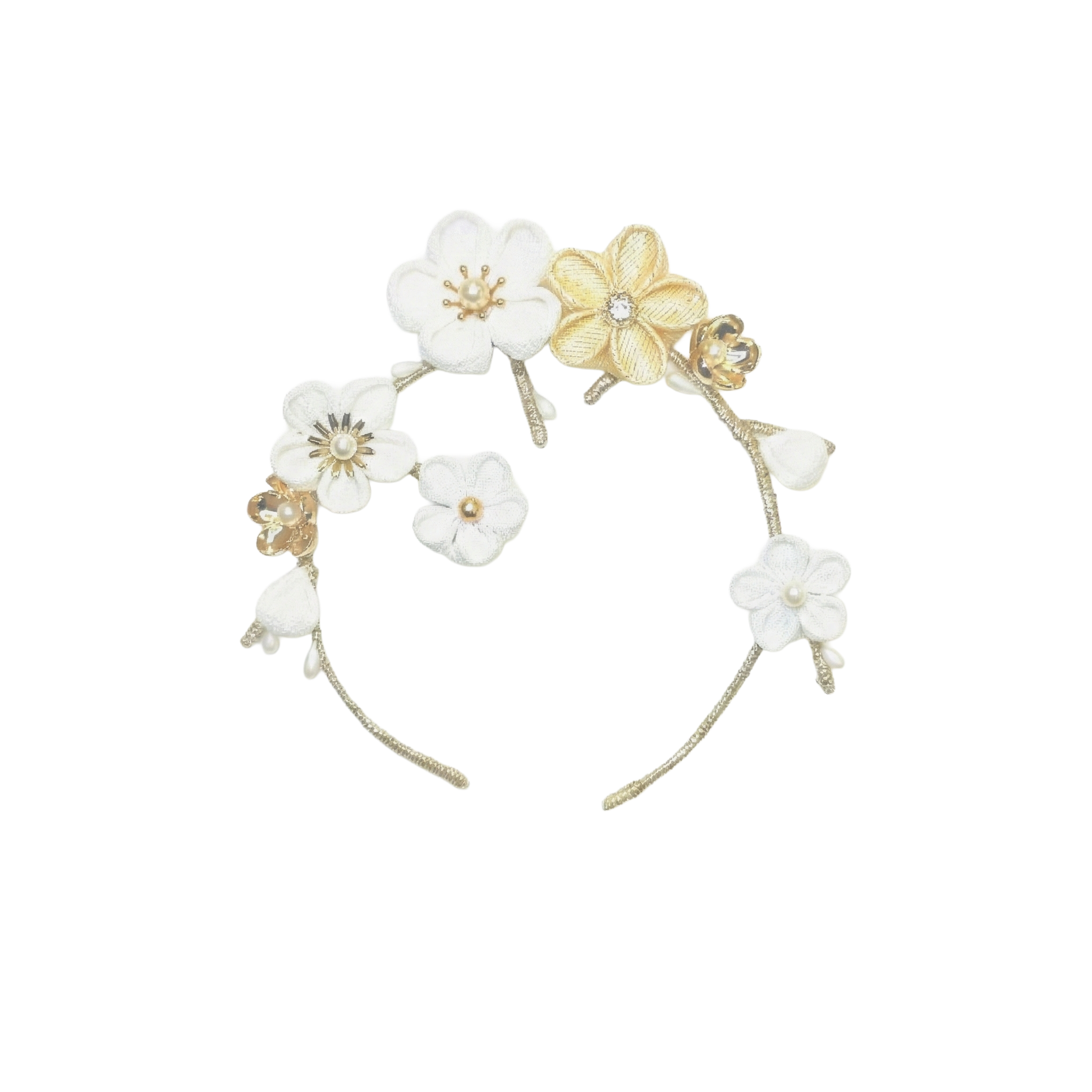 優しい一越ちりめんで作られた梅の花と、枝のワイヤーには全てに金糸が手巻きされており、ライトに当たると華やかさが増すデザインになっています。