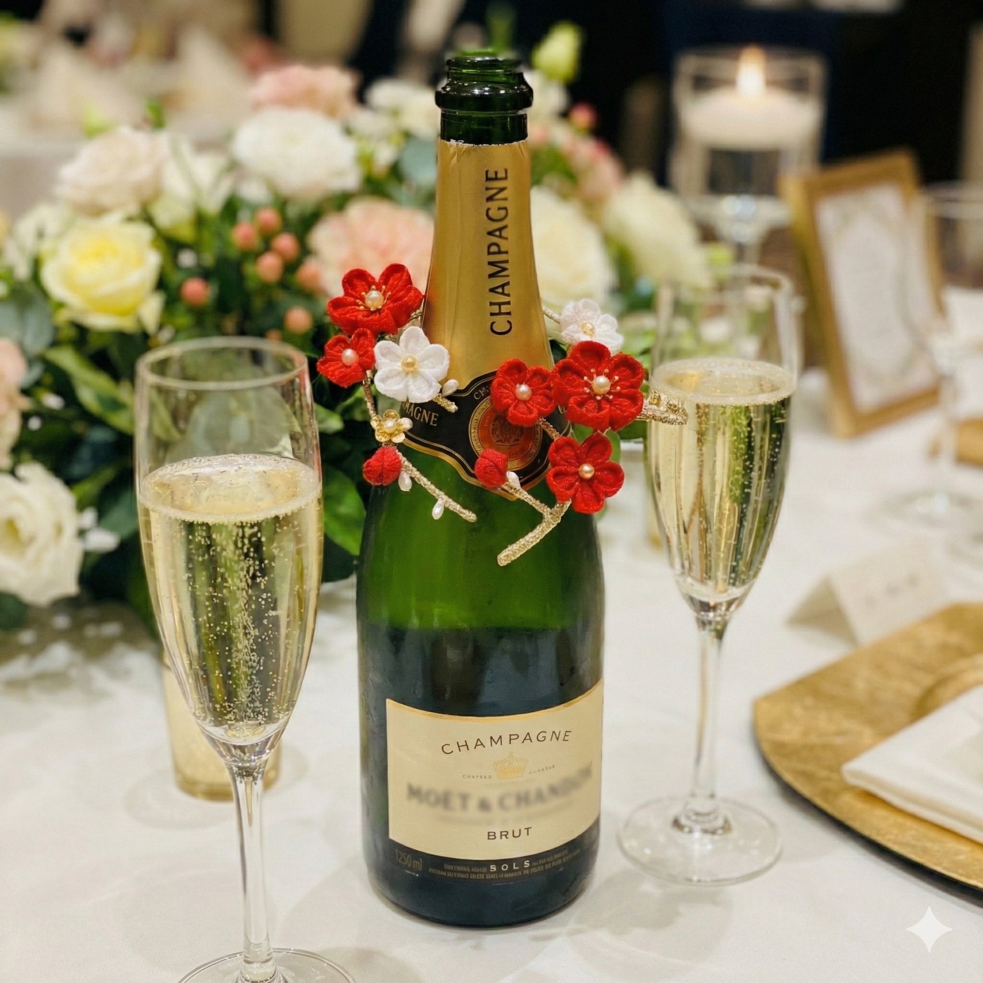 リングケースの飾りとしてだけでなく、お式の際にはシャンパンなどのボトルに掛けてテーブルを彩る用途にもお使い頂けます。