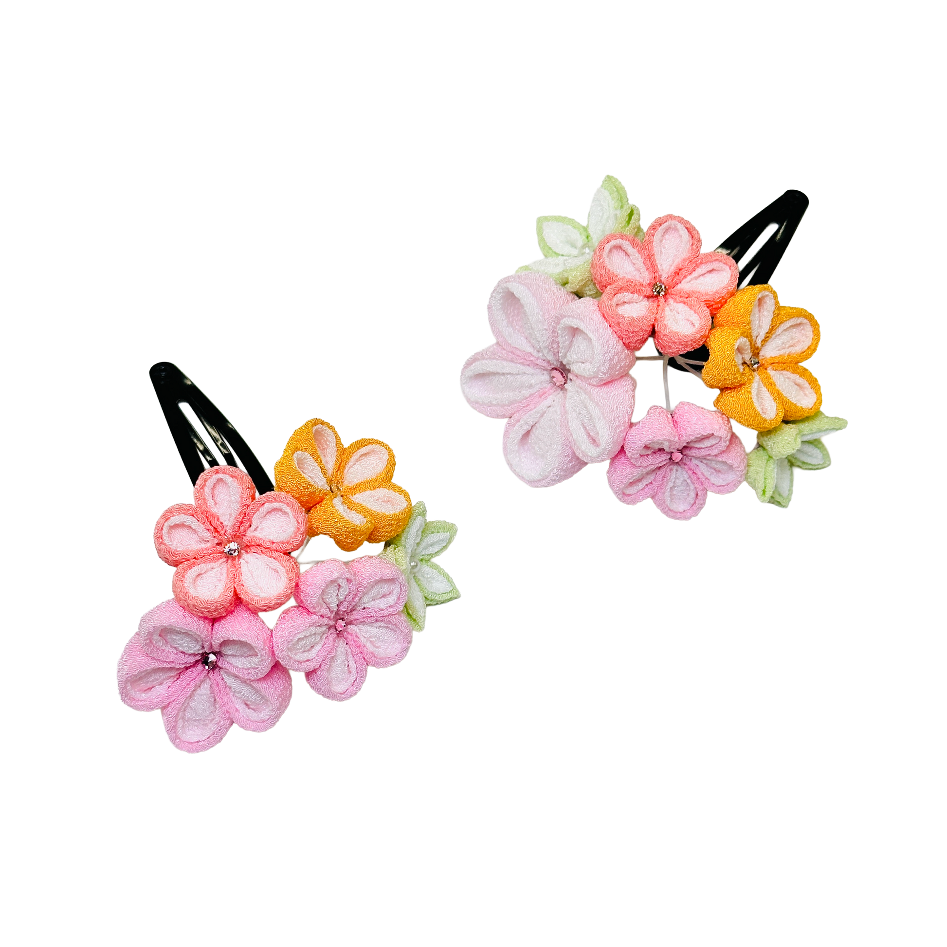 パステルカラーの重ね丸つまみを使った、可愛らしい髪飾りです。三歳さんや髪の毛の少ないお子さん向けにパッチンピン仕立てになっています。