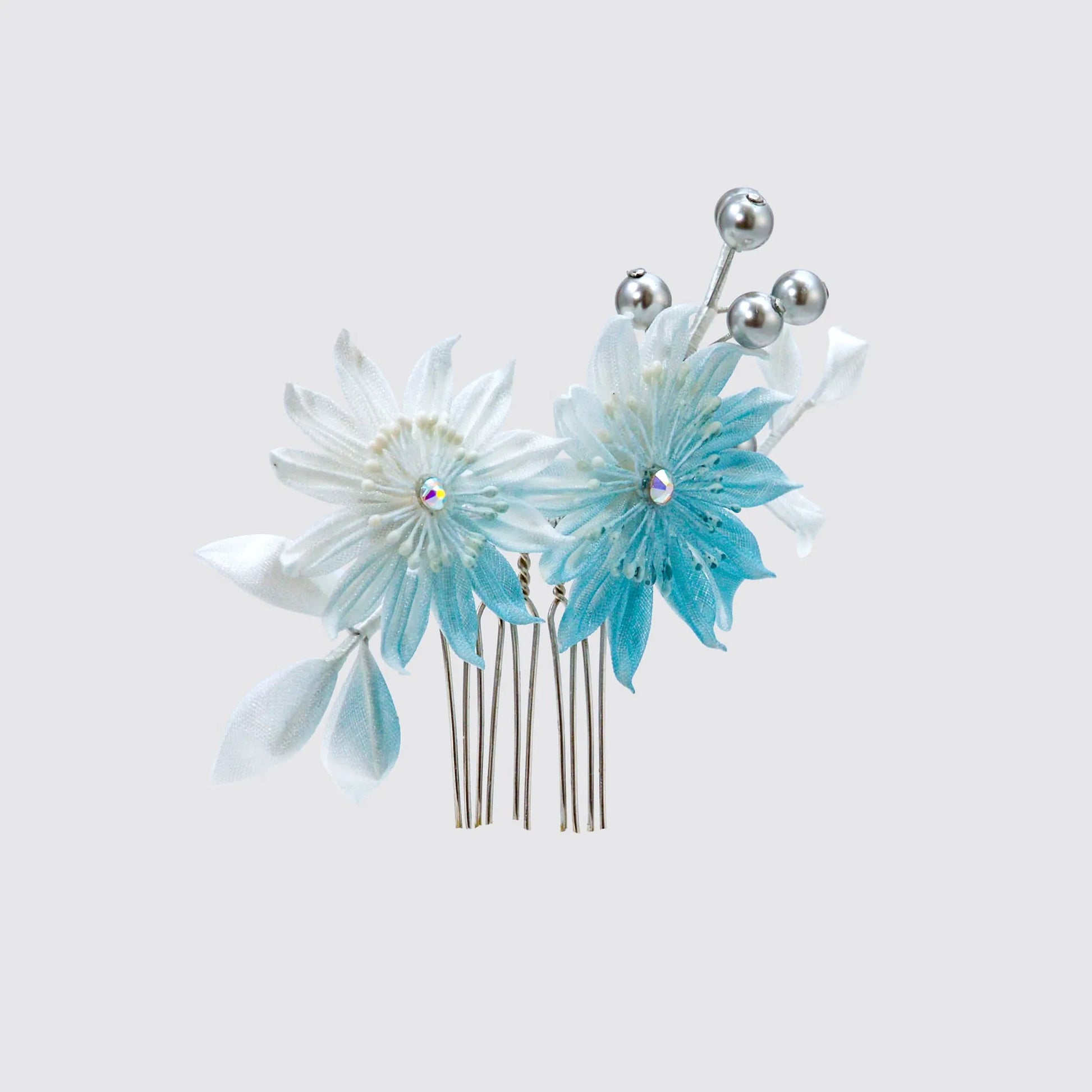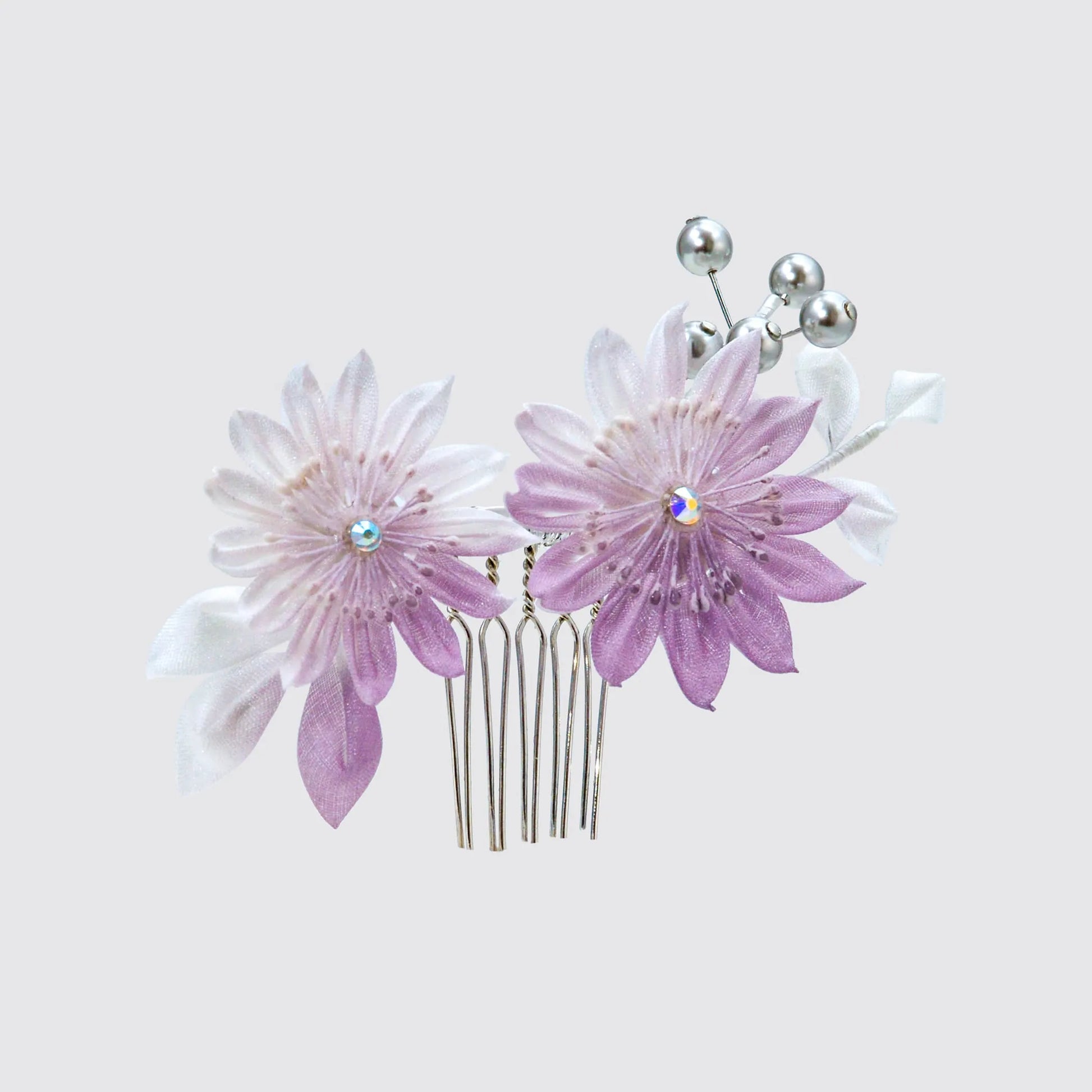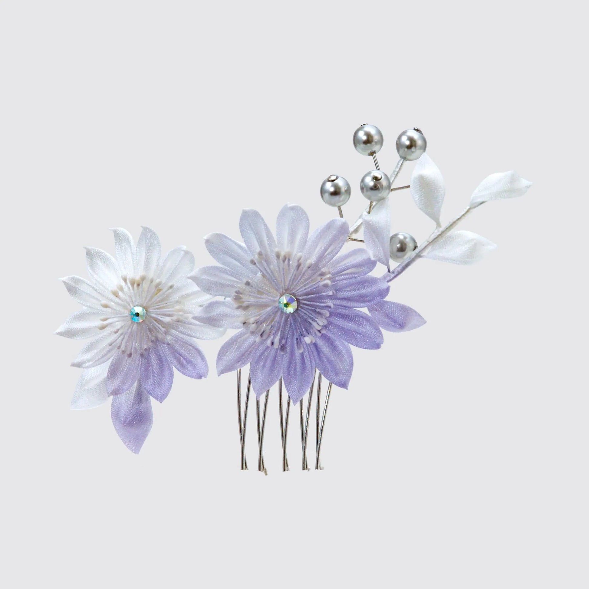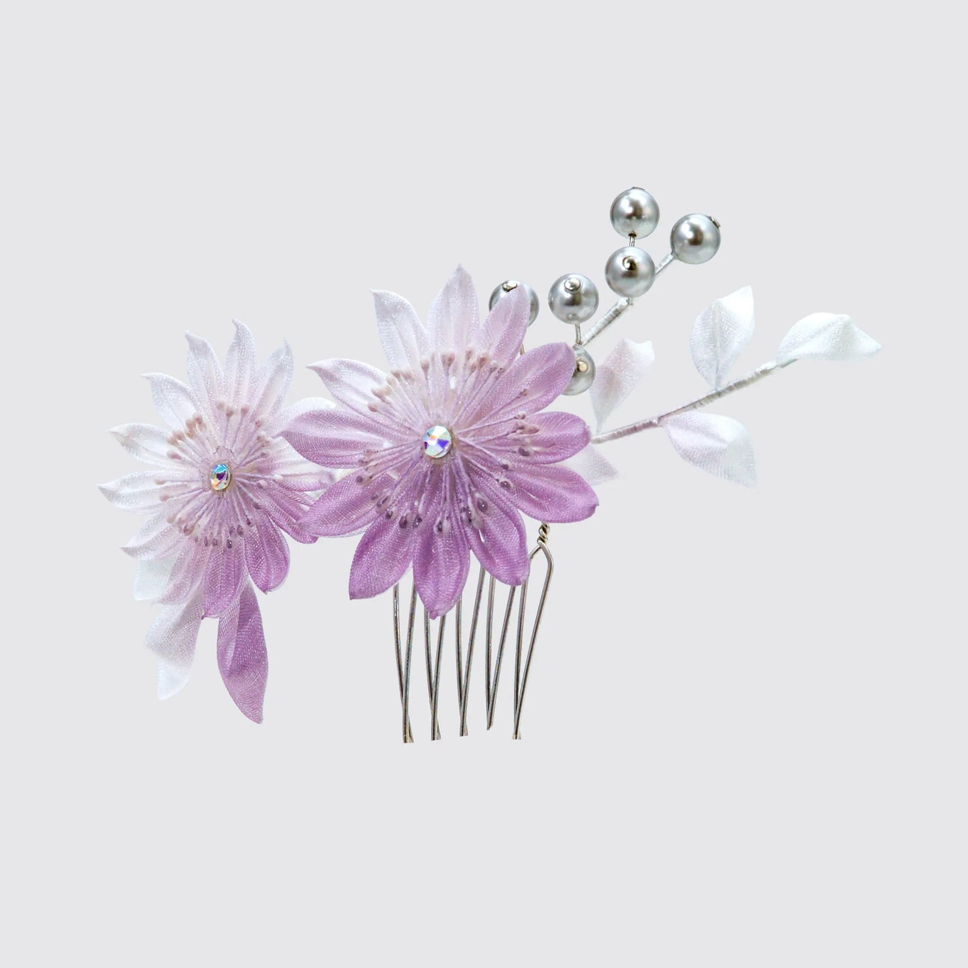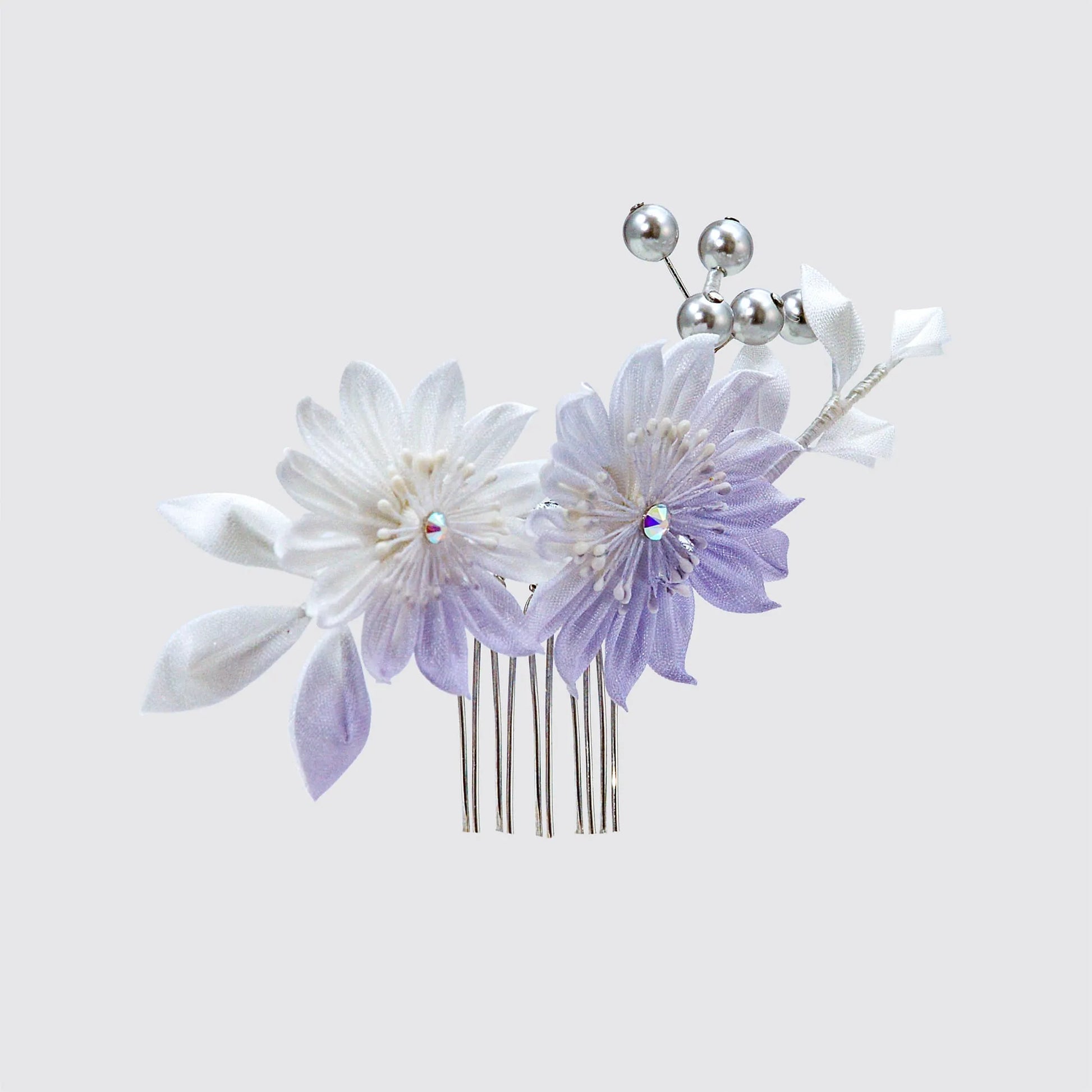 福島県の川俣地方に伝わる「濡れ横」という伝統製法により織られた正絹の羽二重に三重県の伝統工芸「鈴鹿色墨」でぼかし染めを施した髪飾りです。和装家の方々に好評を頂いており、さりげない中にも品のある繊細な表情が魅力です。白い茶花に想像の色を付けたデザインになっています。福島県の川俣地方に伝わる「濡れ横」という伝統製法により織られた正絹の羽二重に三重県の伝統工芸「鈴鹿色墨」でぼかし染めを施した髪飾りです。白い茶花に想像の色を付けたデザインになっています。