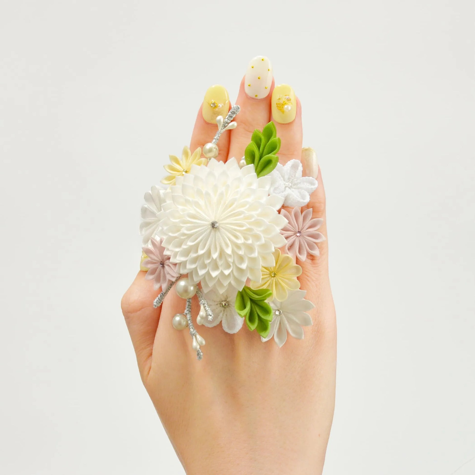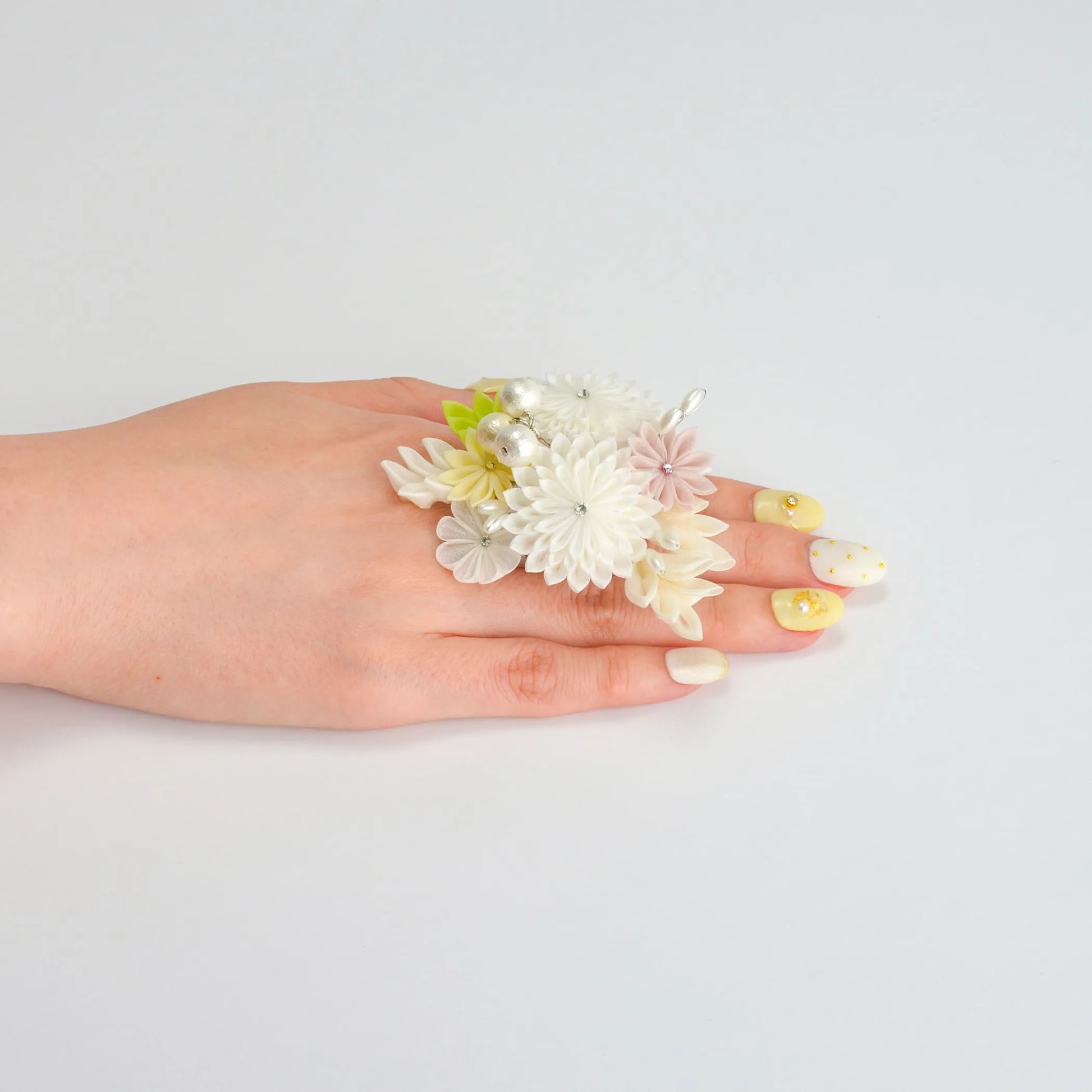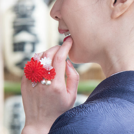 七五三や十三詣りのお子様もつけられるフリーサイズのリングです。ちりめん素材の多いお子様の髪飾りですが、一凛堂では羽二重素材も人気があります。少し小振りにお仕立てしてありますが、お子様がつけて大人びた雰囲気になります。