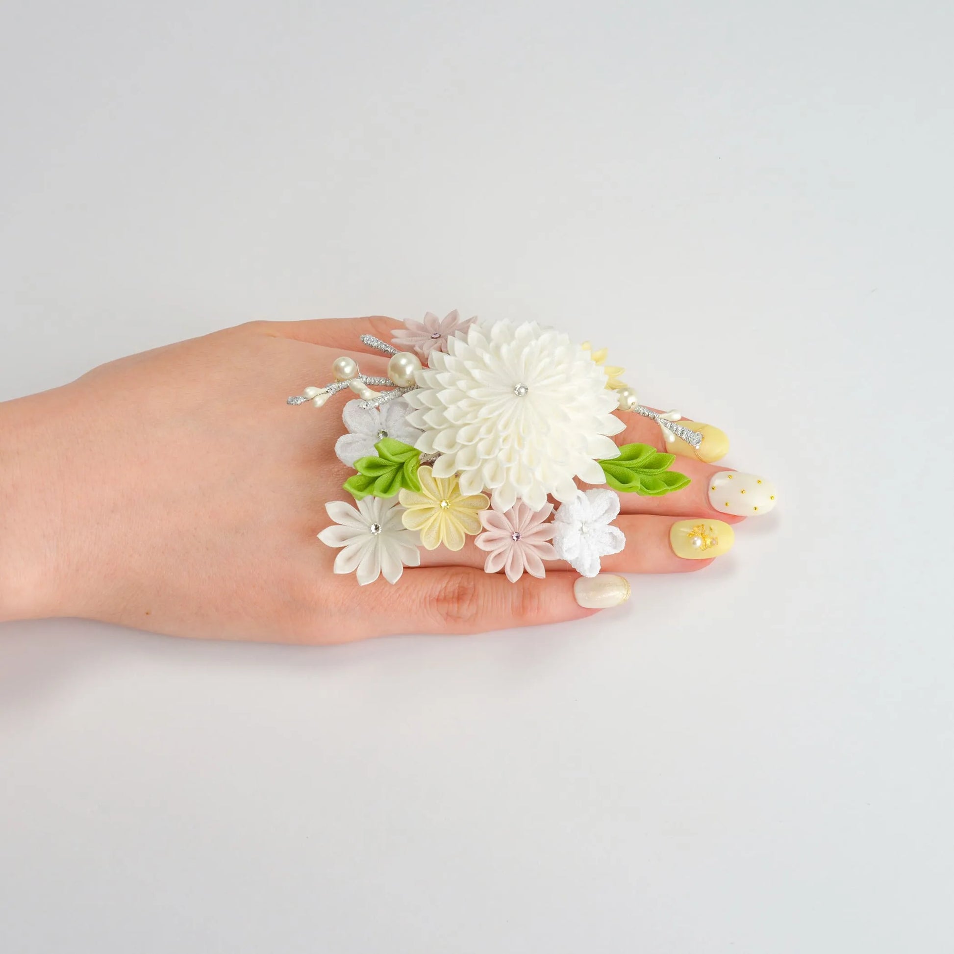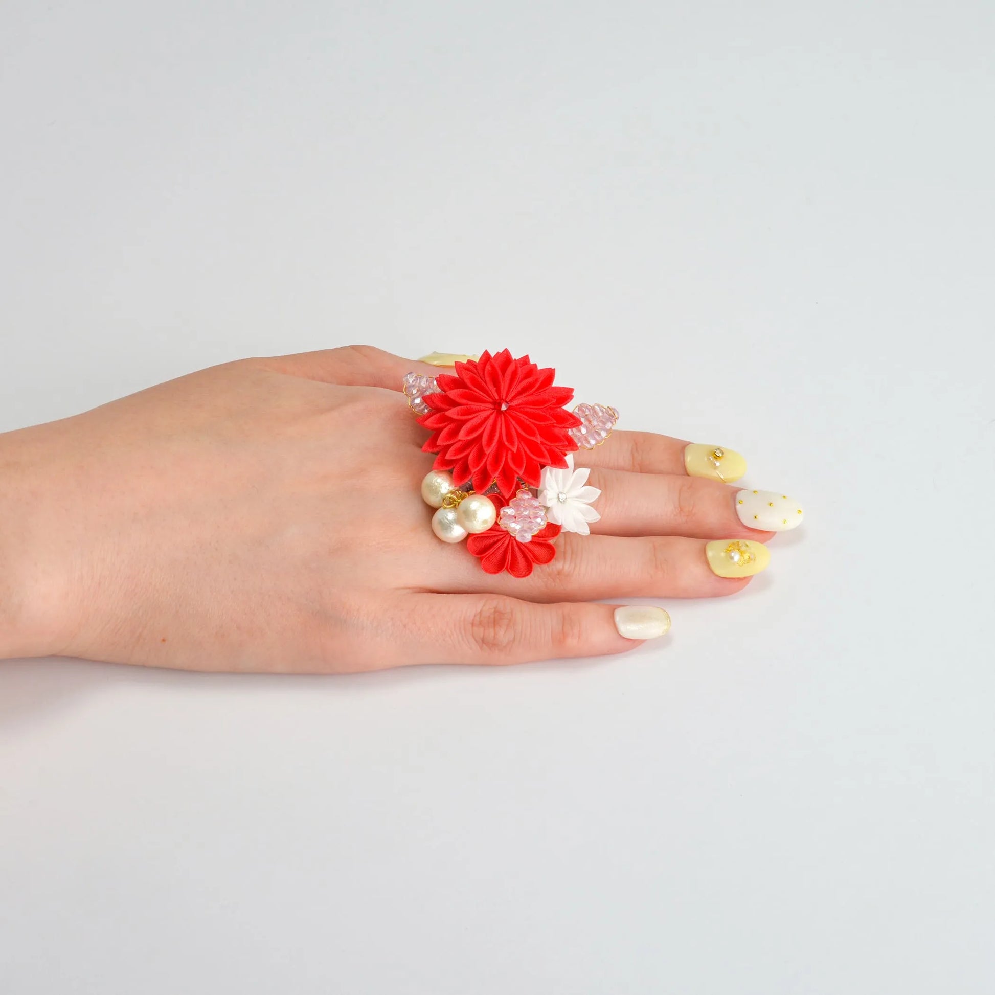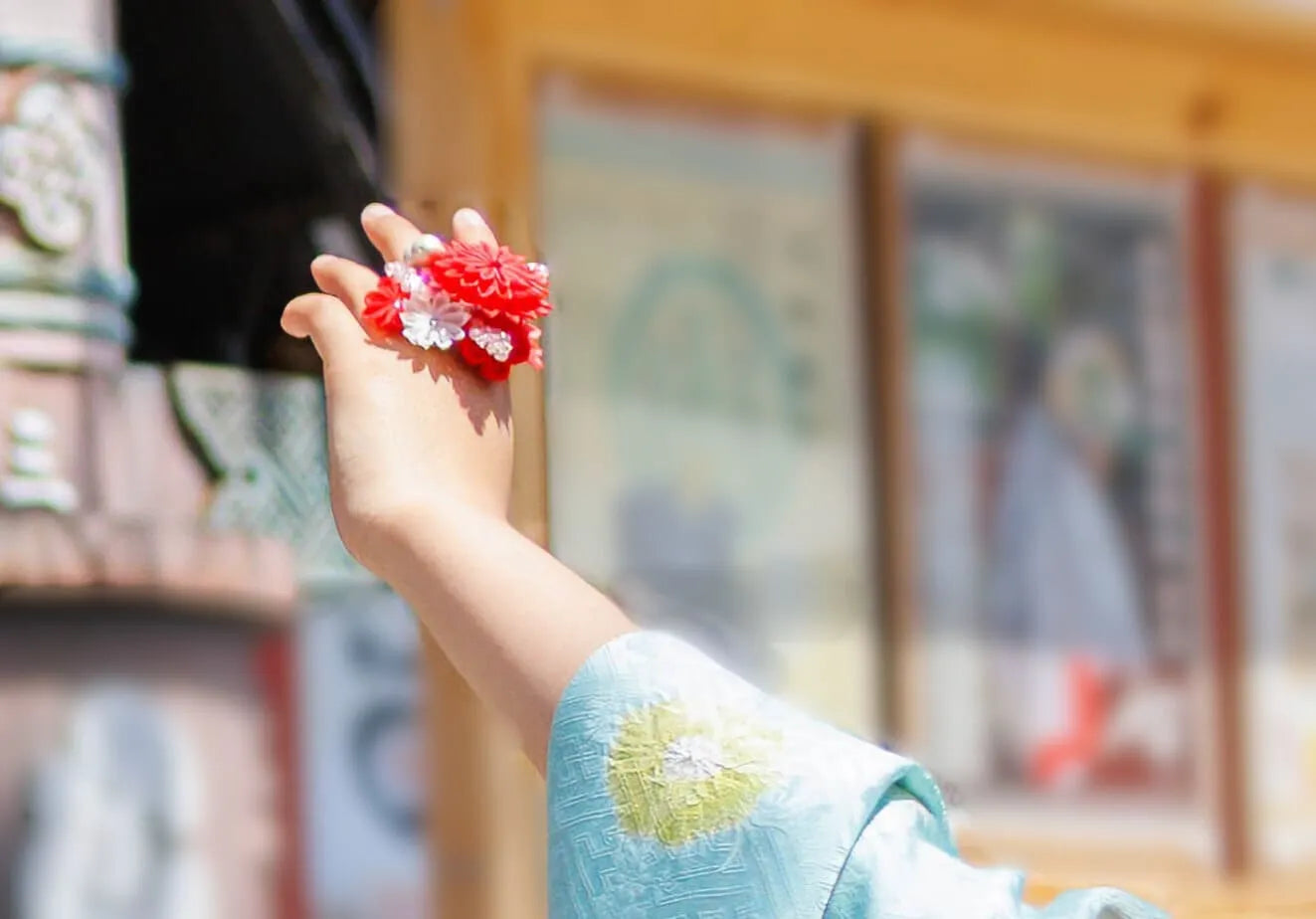 七五三や十三詣りのお子様もつけられるフリーサイズのリングです。ちりめん素材の多いお子様の髪飾りですが、一凛堂では羽二重素材も人気があります。少し小振りにお仕立てしてありますが、お子様がつけて大人びた雰囲気になります。