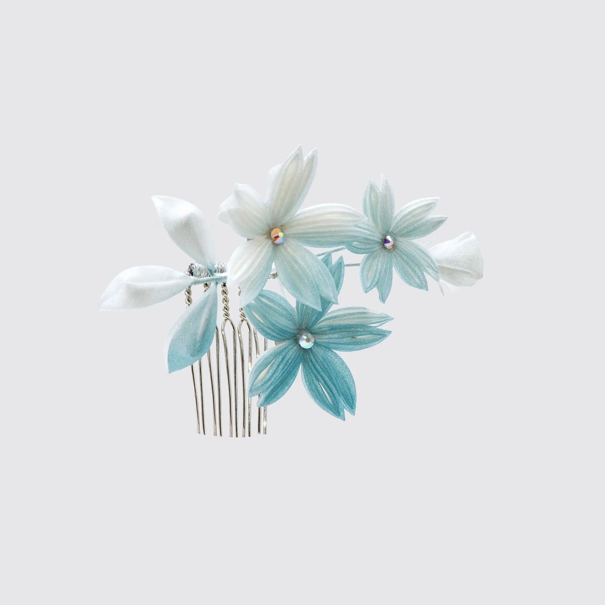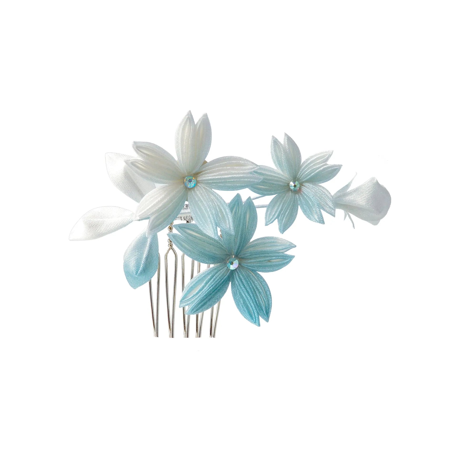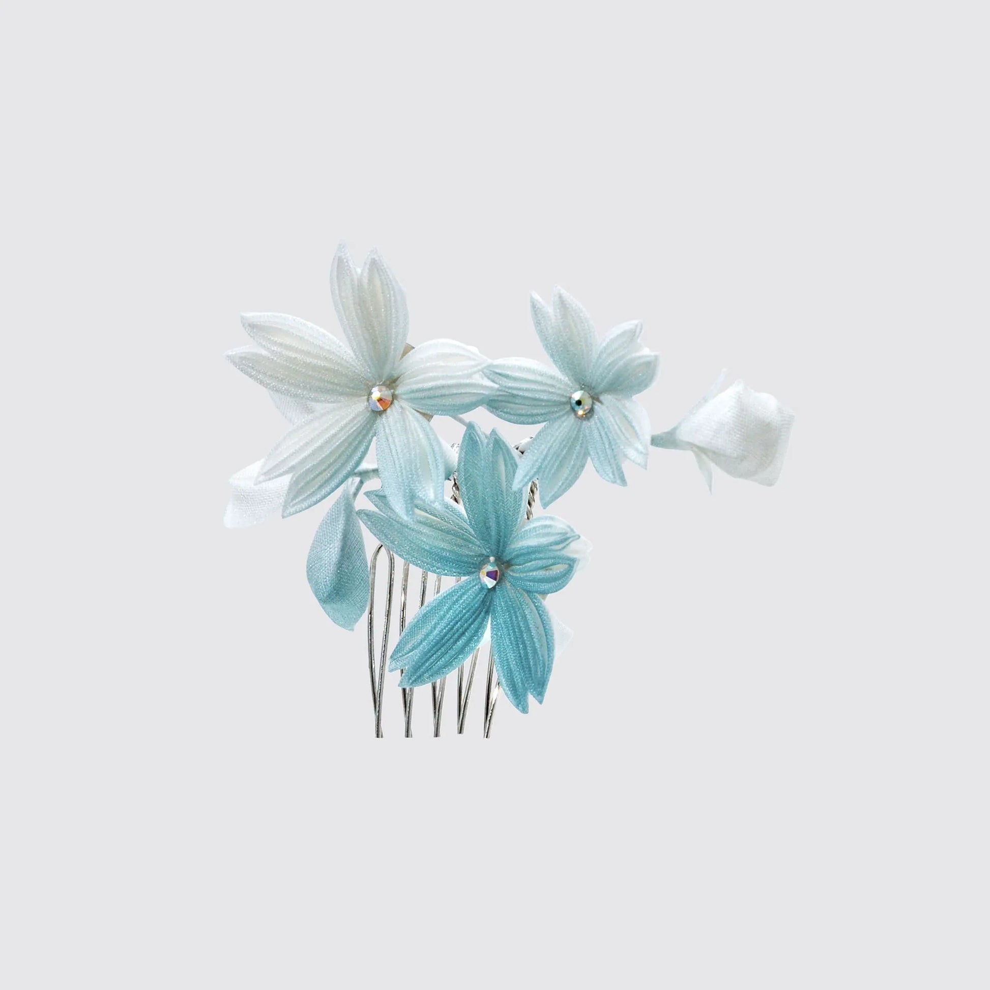 福島県の川俣地方に伝わる「濡れ横」という伝統製法により織られた正絹の羽二重のつまみ細工に三重県の伝統工芸「鈴鹿色墨」でぼかし染めを施した髪飾りです。和装家の方々に好評を頂いており、さりげない中にも品のある繊細な表情が魅力です。福島県の川俣地方に伝わる「濡れ横」という伝統製法により織られた正絹の羽二重のつまみ細工に三重県の伝統工芸「鈴鹿色墨」でぼかし染めを施した髪飾りです。