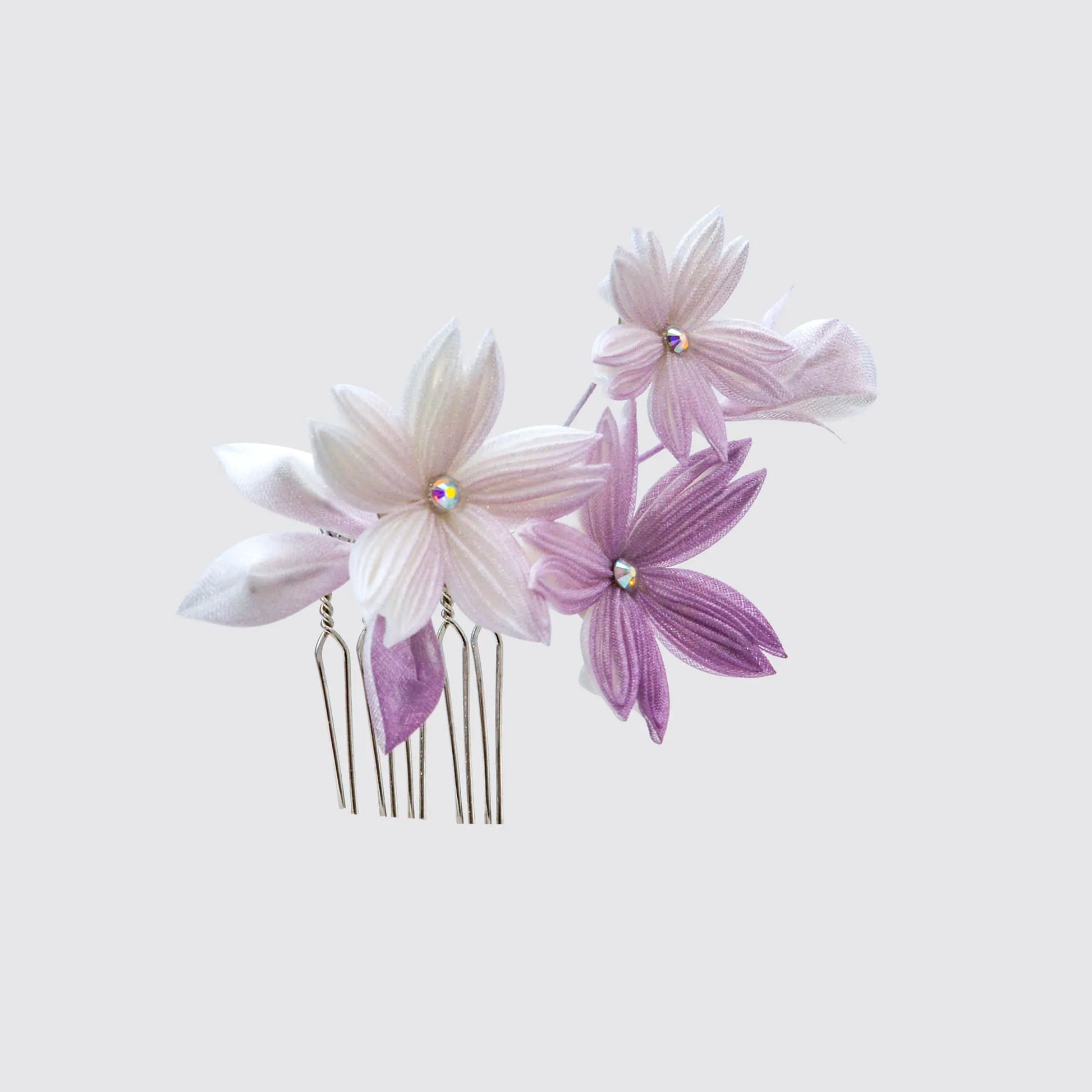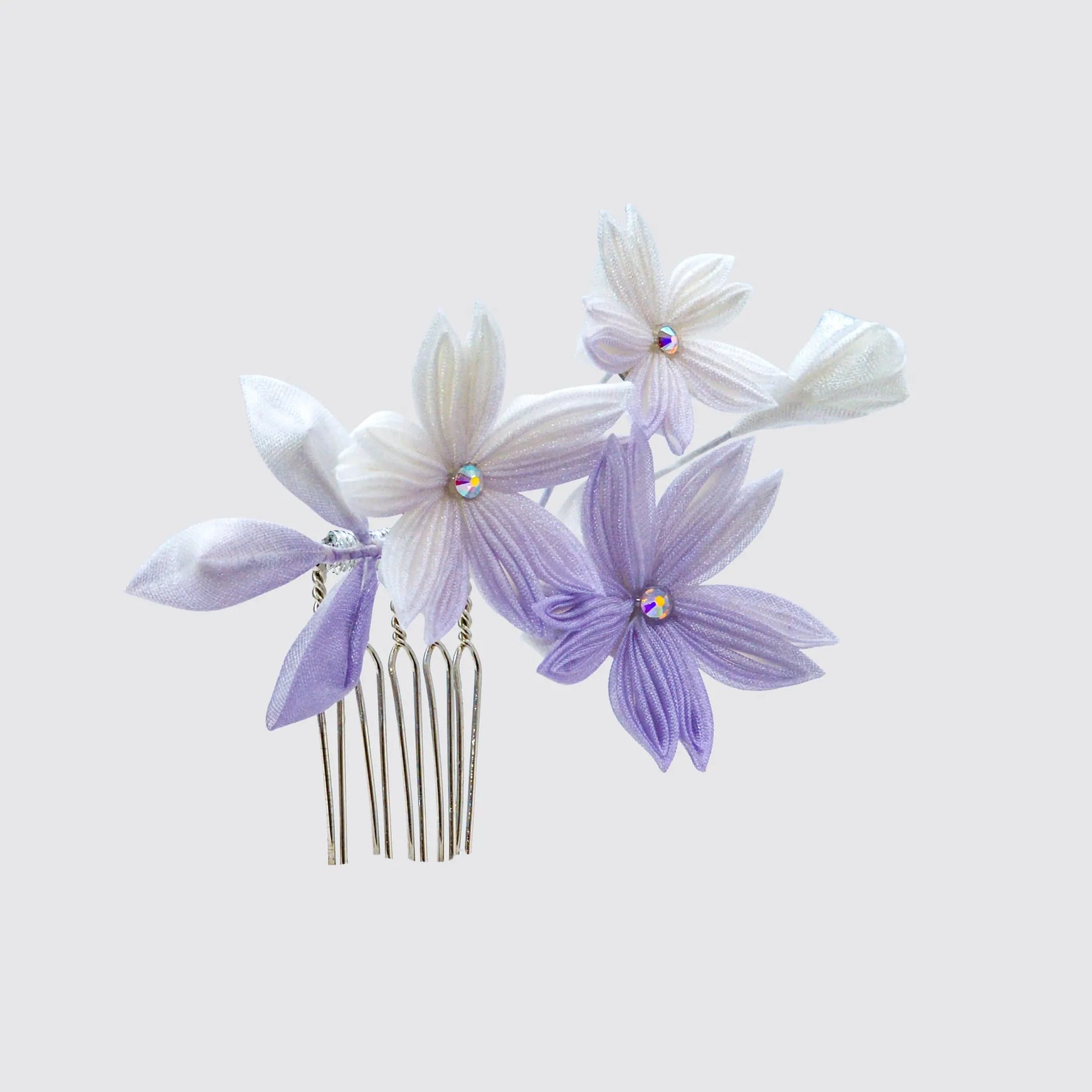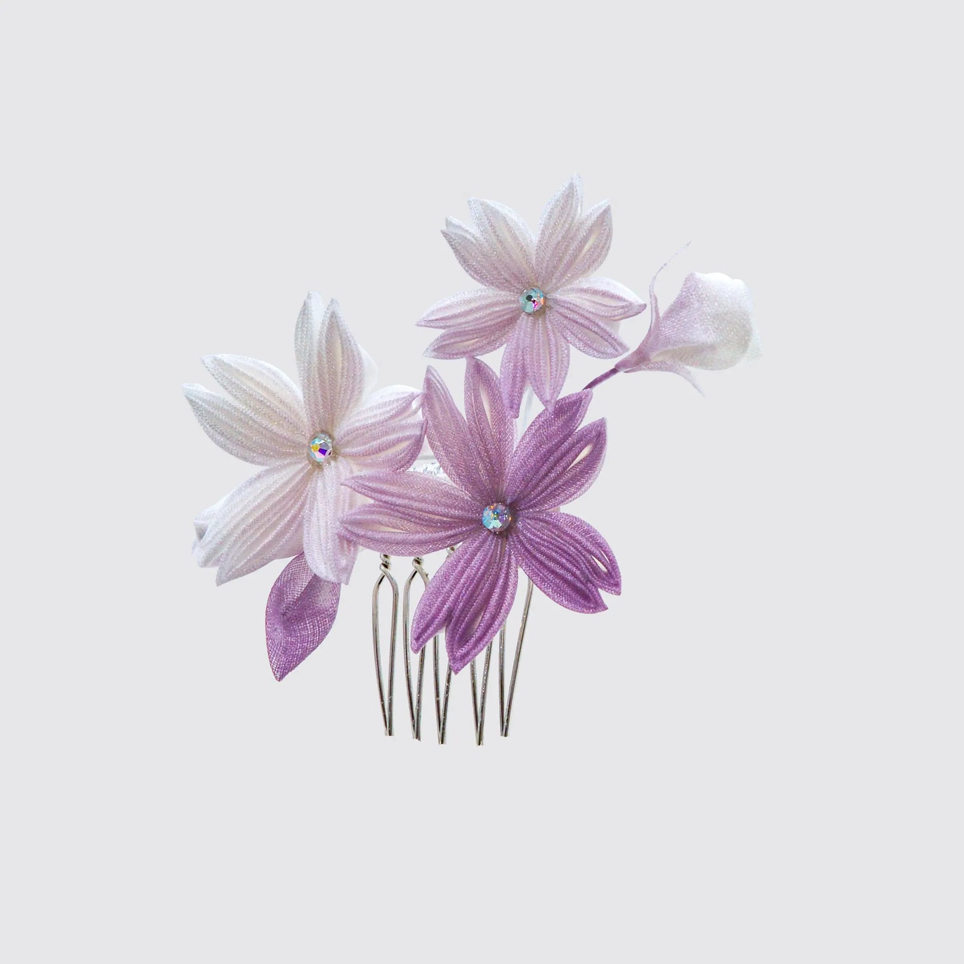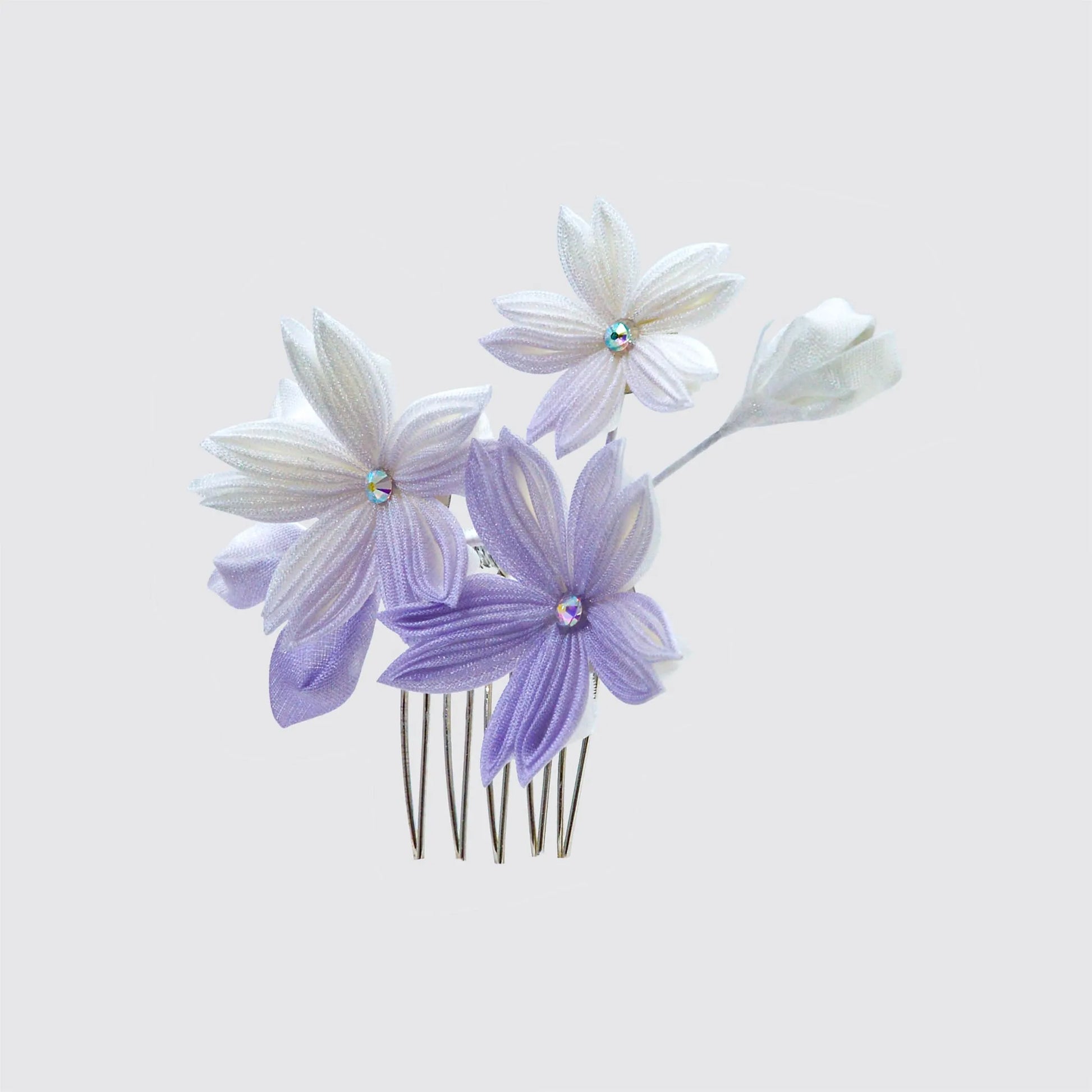福島県の川俣地方に伝わる「濡れ横」という伝統製法により織られた正絹の羽二重のつまみ細工に三重県の伝統工芸「鈴鹿色墨」でぼかし染めを施した髪飾りです。和装家の方々に好評を頂いており、さりげない中にも品のある繊細な表情が魅力です。福島県の川俣地方に伝わる「濡れ横」という伝統製法により織られた正絹の羽二重のつまみ細工に三重県の伝統工芸「鈴鹿色墨」でぼかし染めを施した髪飾りです。