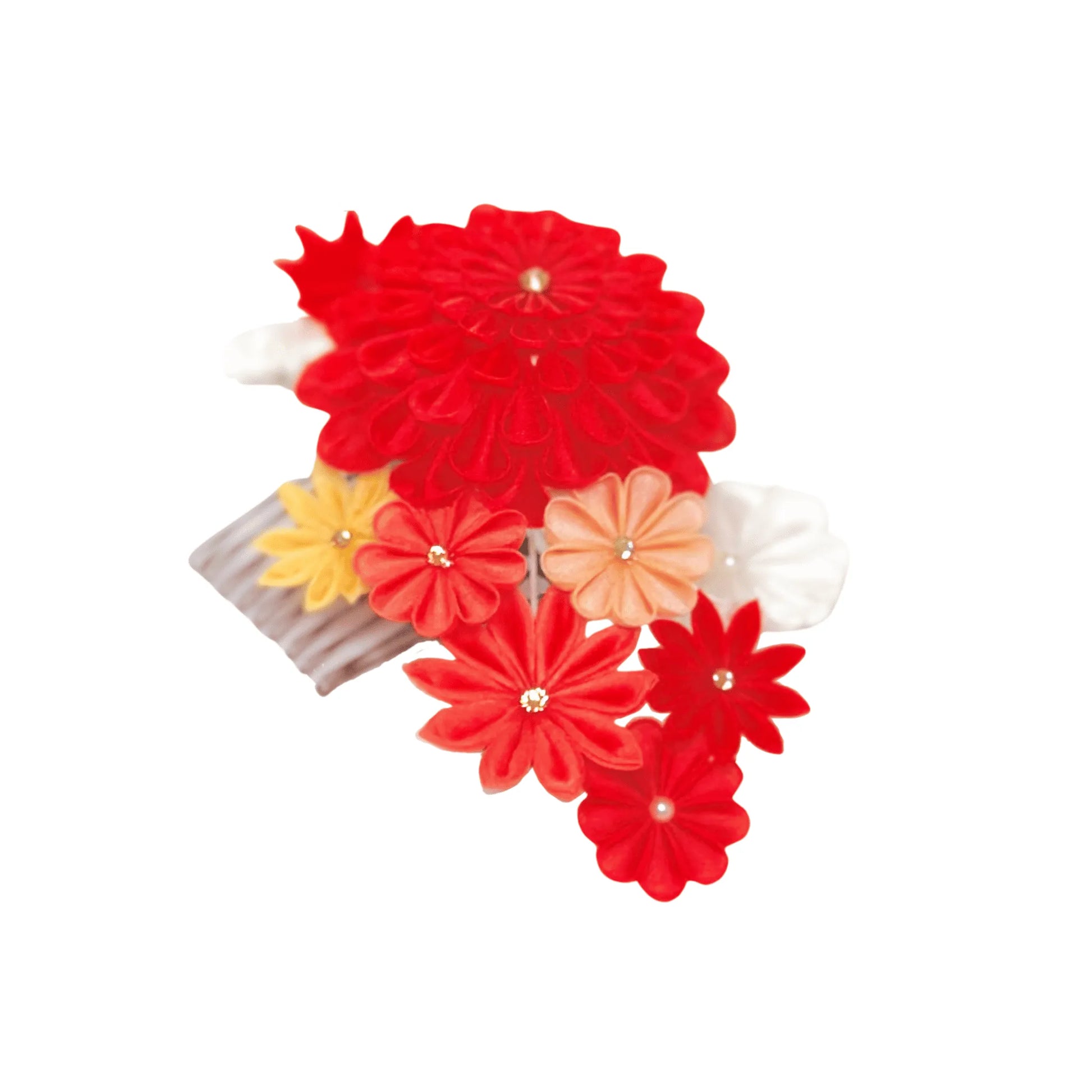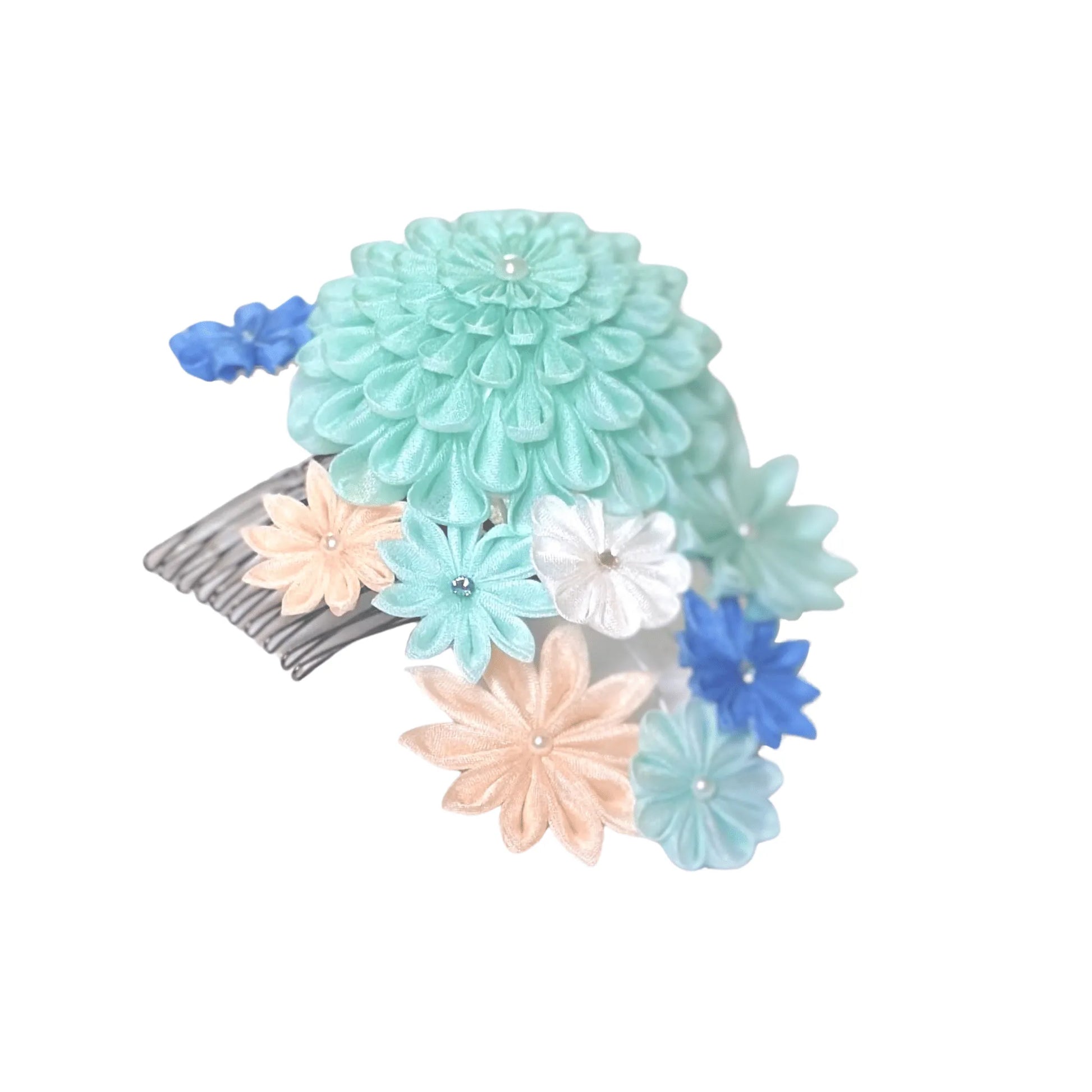 この「ふかがわ」は、一凛堂でははじめての「丸つまみの段菊」を使用した成人式向けの髪飾りです。