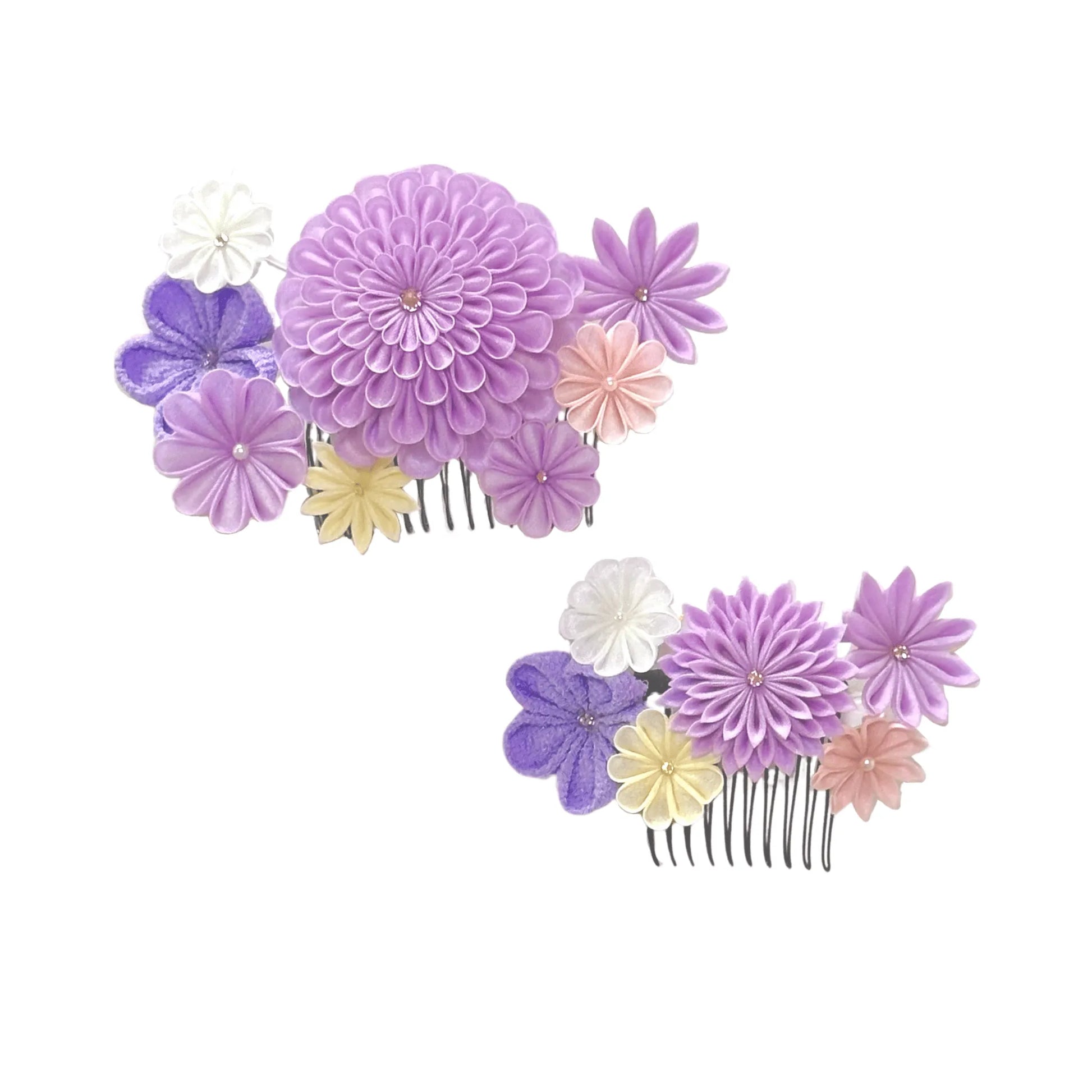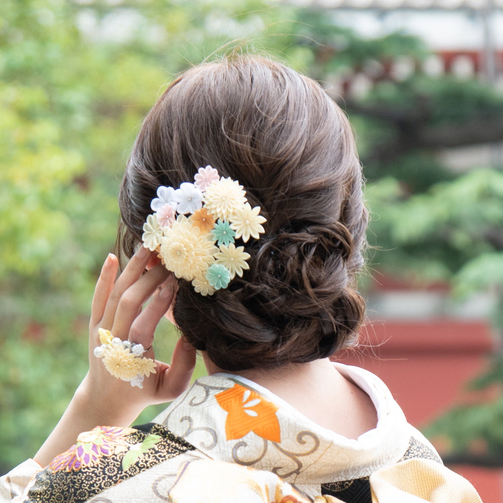 この「はまちょう」は、一凛堂でははじめての「丸つまみの段菊」を使用した成人式向けの髪飾りです。