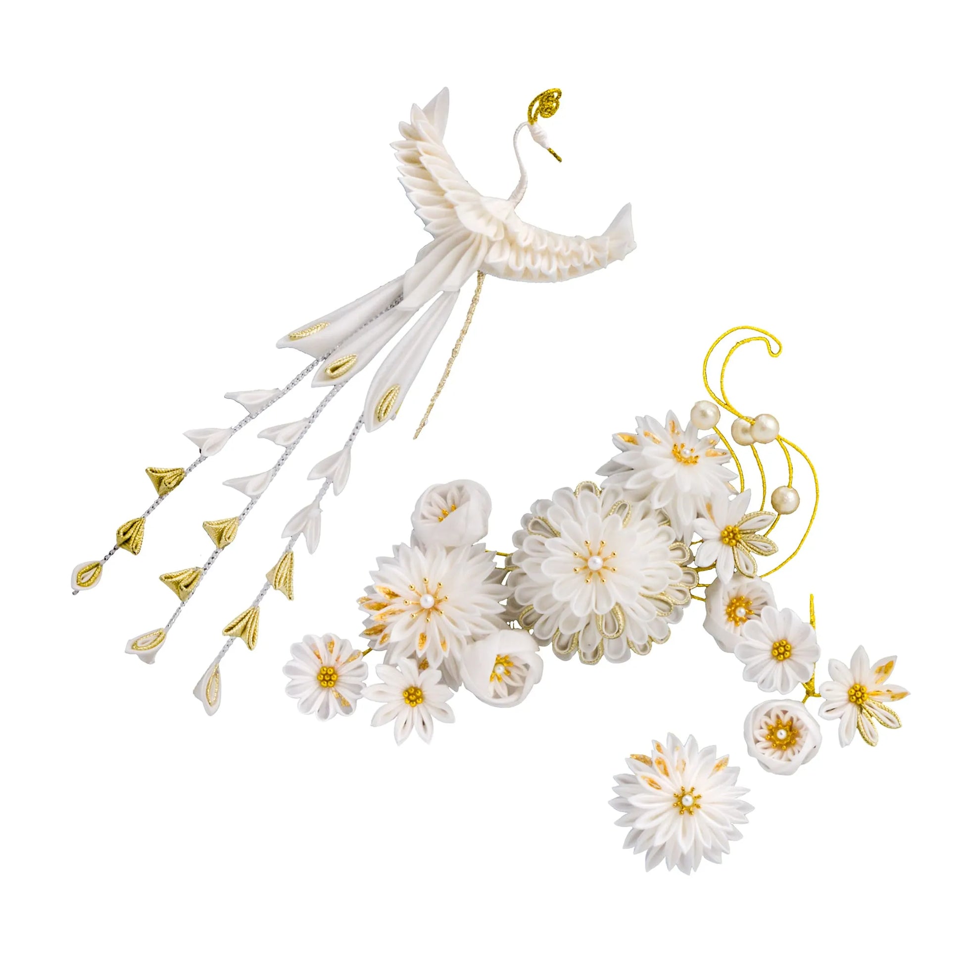 「鳳凰」に組み合わせてデザインされたセットです。豪華さの点では一凜堂の髪飾りの中でもトップクラスです。成人式から和装婚礼、ドレス姿にもマッチするデザインになっています。「鳳凰」に組み合わせてデザインされたセットです。