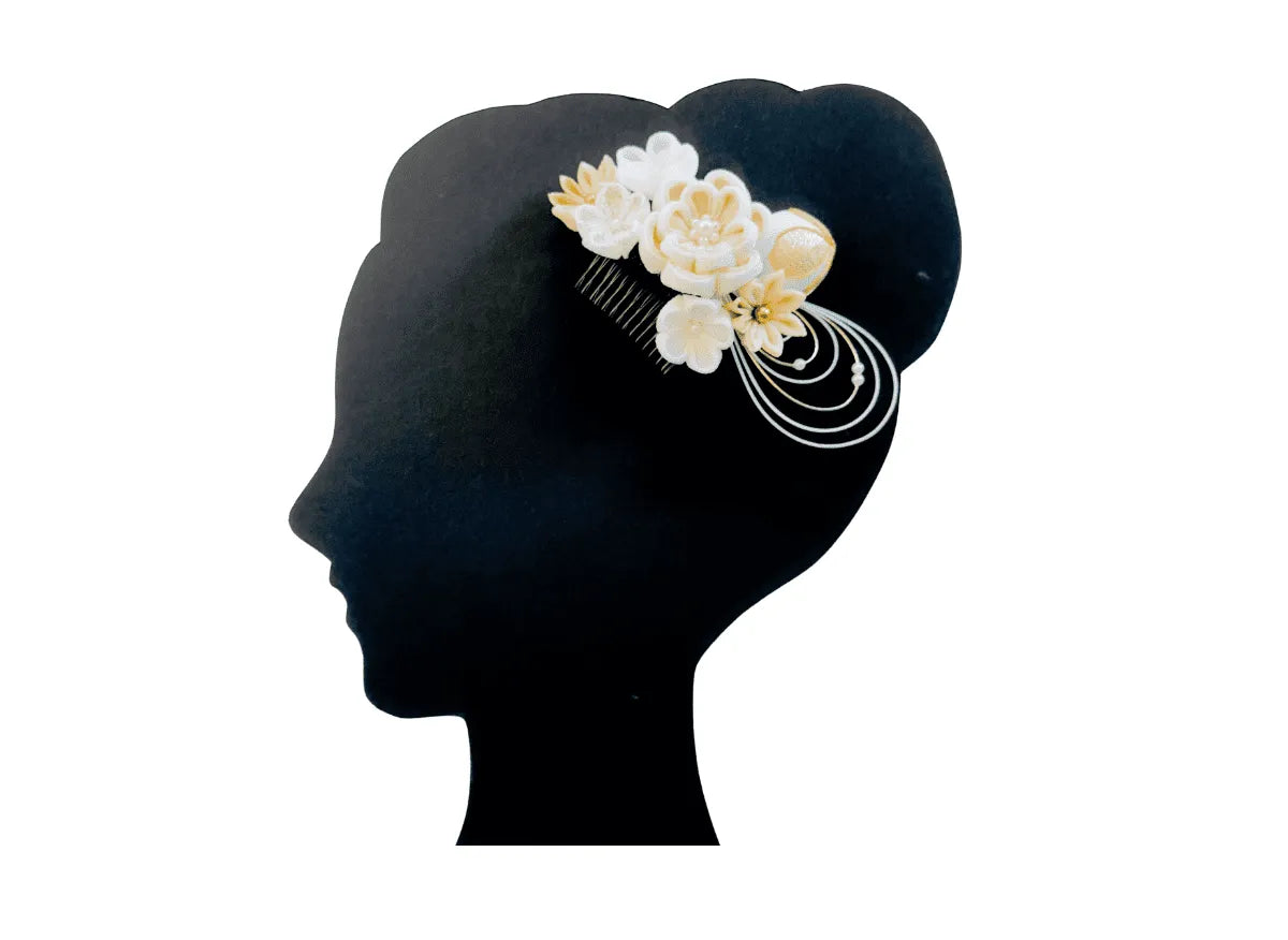 優しい印象のちりめん素材と現代風なゴールドの飾り玉や水引を合わせたコーム式の髪飾りです。