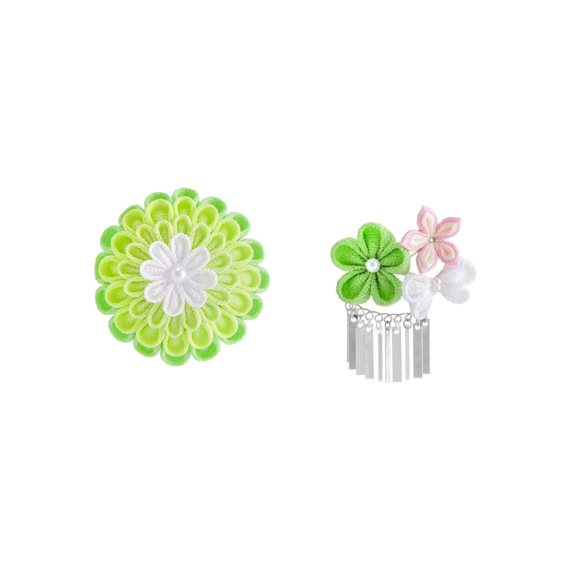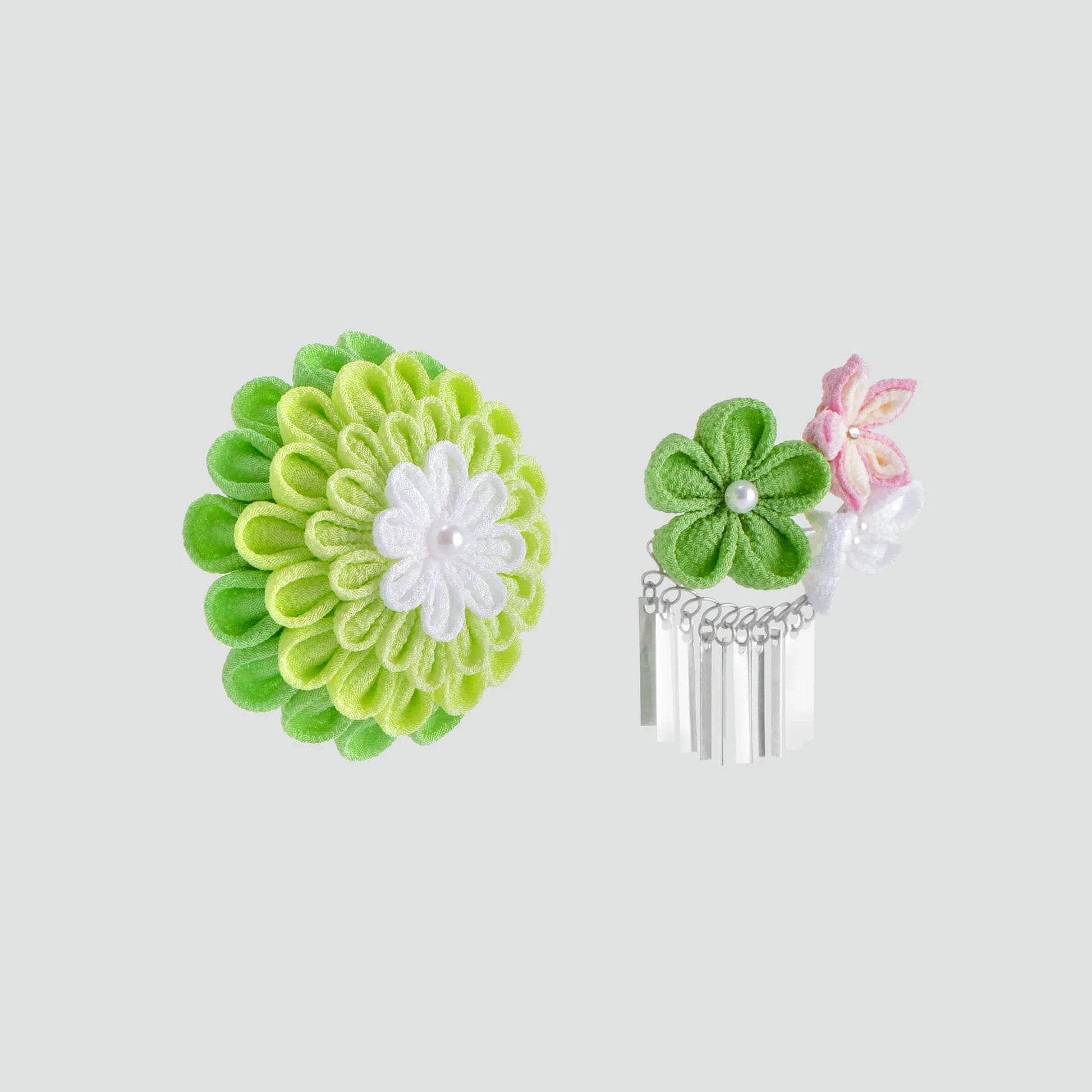 柔らかい風合いと生地表面の凹凸が独特な一越ちりめんを使って、つまみかんざしの真骨頂とも言える「段菊」をお仕立てしました。小さなお子様の髪にも合うベストバランスを考え、丸つまみで1段の高さにしました。まだ髪の量も少ないとコーム式では固定出来ないためパッチンピン仕立てになっています。
