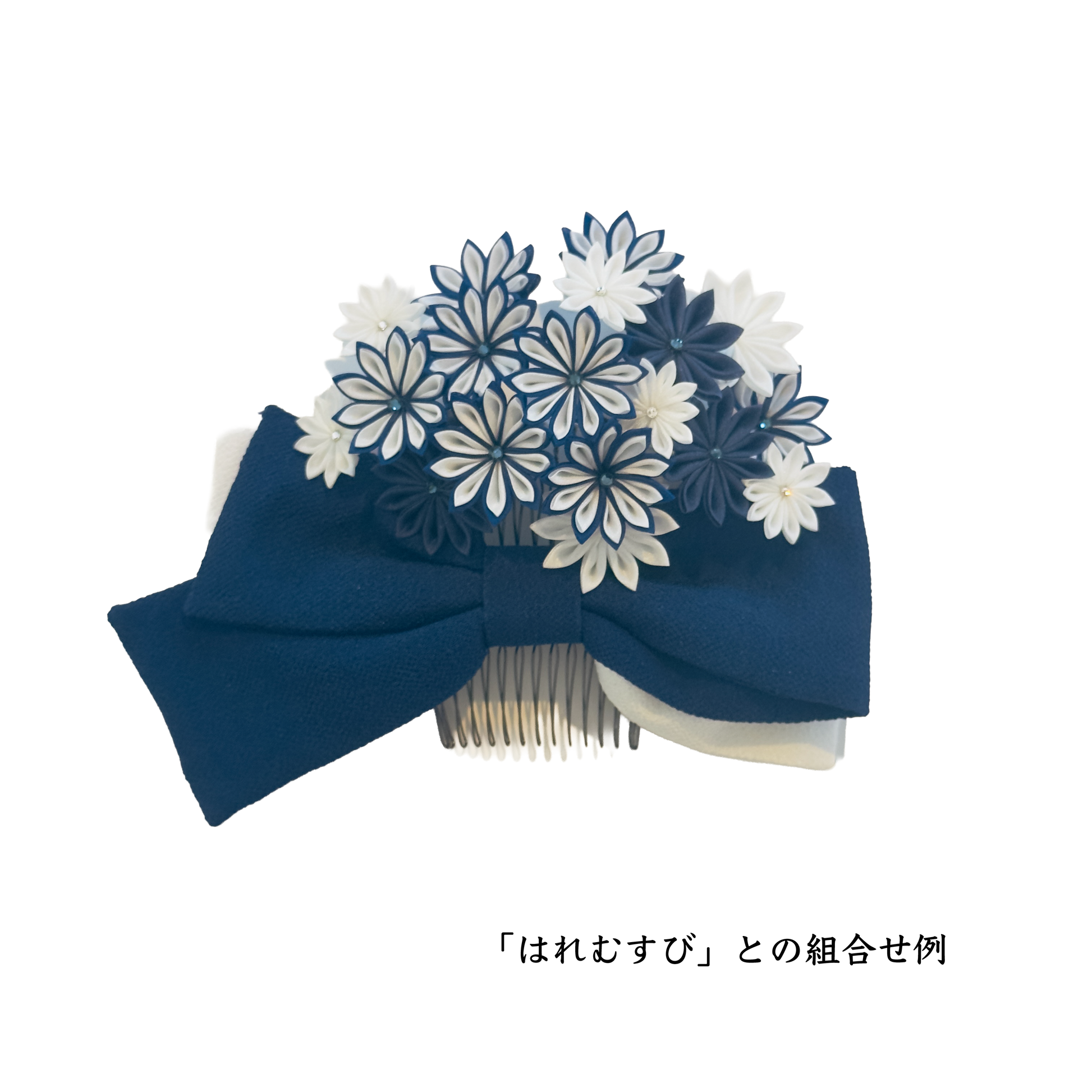 福島県の川羽地方に伝わる「濡れ横」という伝統技法で織られた「川俣羽二重」をつまみ細工の基本である「剣つまみ」のみで組み上げたシャープなイメージのコーム式髪飾りです。